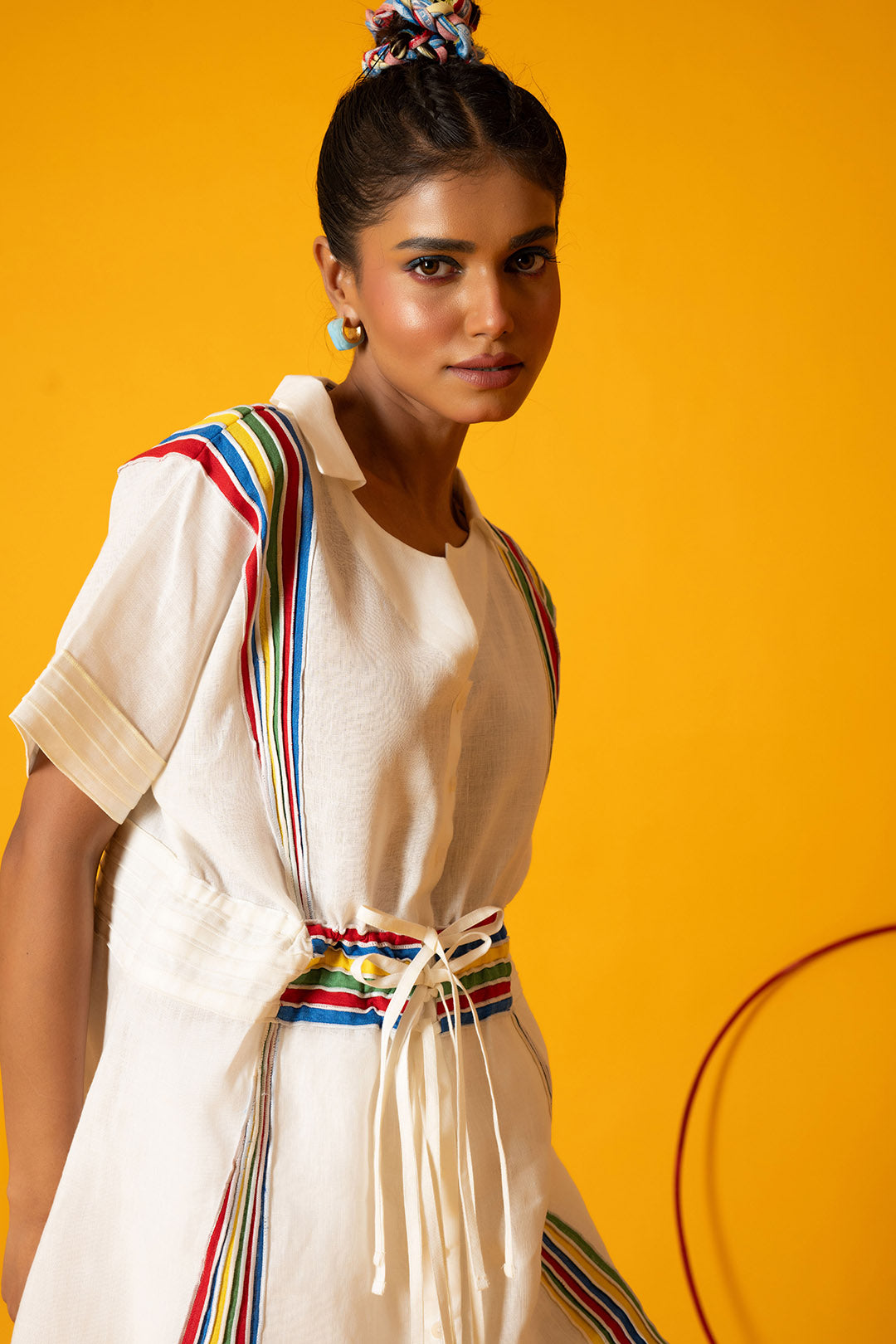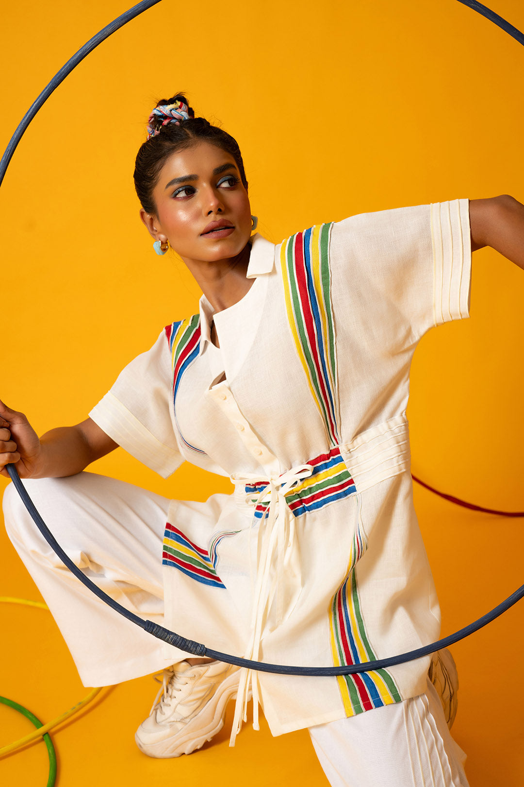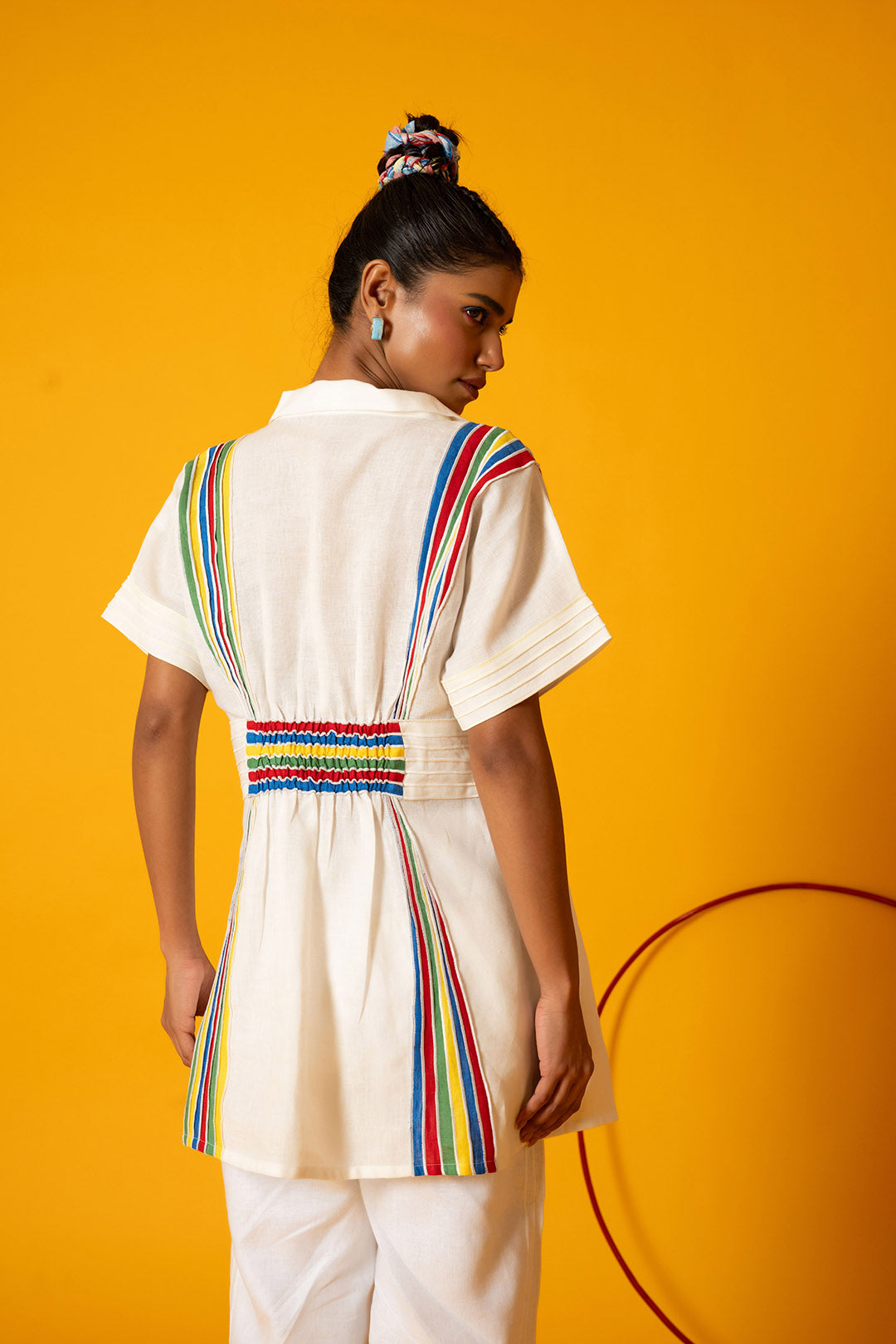 Woven from cloud and sunlight, like nature’s brush across the dew. The White Sapphire Ray Top is crafted with soft white premium linen. It flows with grace, kissed by panels of colorful fabrics featuring delicate white thread detailing. A statement piece that’s effortlessly graceful and uniquely detailed. It brings color, comfort, and character to your everyday look